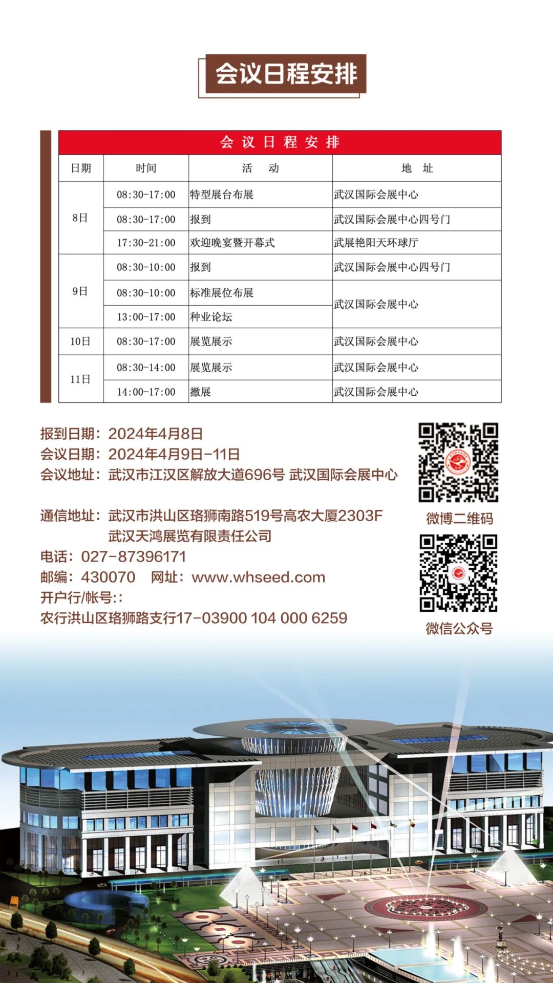 各位种业界同仁:第41届武汉种子交易会将于2024年4月9日至11日继续在武汉国际会展中心举行。第41届会议在展厅布局上做了重大调整,将二楼的现货交易区调整为一楼 ,中厅、西厅结合部的限高特展调整为标准展位、东西厅增加了部分特展、在中厅后部设置了新的标准展位。第41届会议还同步配套了丰富的会期活动。