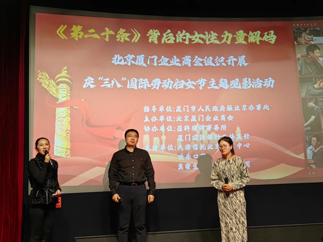 北京厦门企业商会组织会员企业代表、党员代表等各界有代表性的女性同胞100余人一同走进影院,观看影片,并邀请该影片联合出品方最高检影视中心制片人张婷婷和联合编剧北京市朝阳区检察院第四检察部副主任王天毅来到现场,与大家一起交流该影片背后的女性力量解码。天津信托北京财富中心、欢乐口腔、奥蜜生物科技有限公司对本次活动提供了大力支持。
