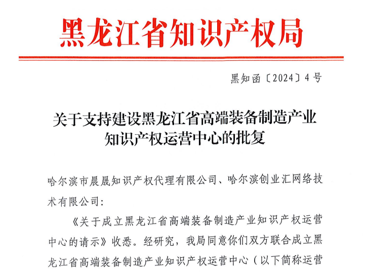 2024年3月8日,黑龙江省知识产权局发布了《关于支持建设黑龙江省高端装备制造产业知识产权运营中心的批复》的通知。