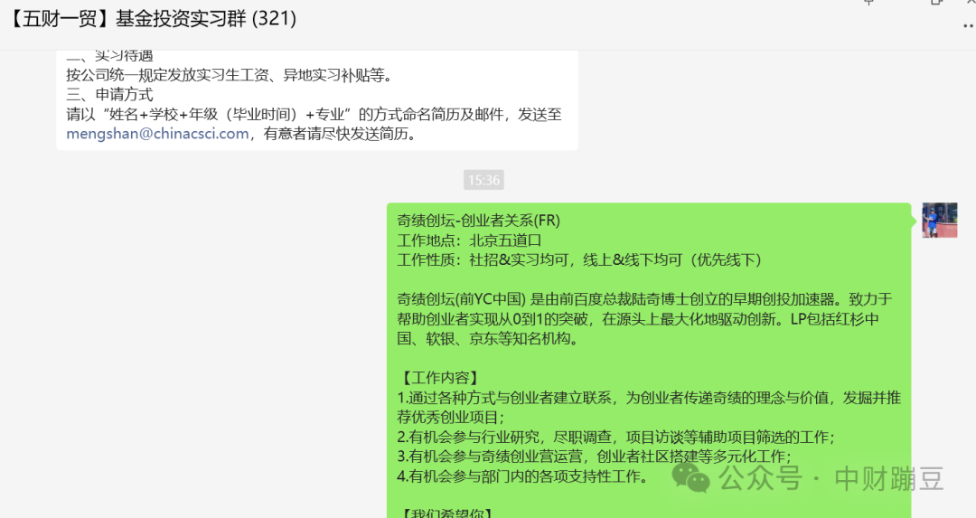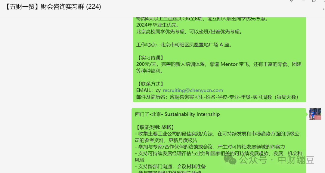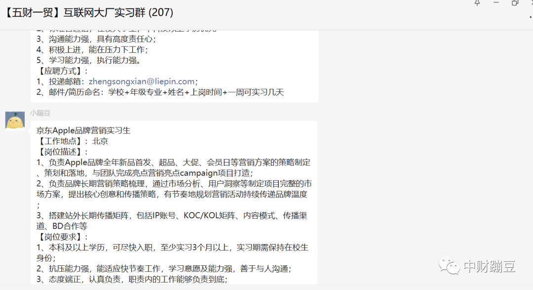 倘若:①作为实习生,你想为自己招继任 ②作为企业员工或HR,为公司招聘实习生,欢迎扫码添加小编微信加急发布实习信息或发送招聘信息至邮箱:cufebengdou@163.com。实习投递邮箱命名末尾加上:+来源中财蹦豆公众号,我们将会为您在本公众号发布招聘信息,同时扩散到C9+五财一贸高校实习微信群中。