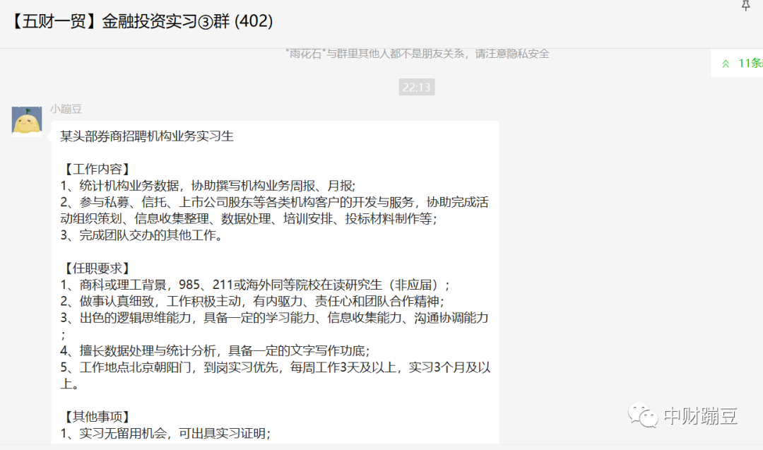 大家好,我是中财蹦豆创办人小黄豆学长,来自于中财,现在大环境不是很好,为了帮助大家打破实习信息差,同时为了更好的让大家获得各行业实习信息,因此,我这边对实习信息群进行了重新划分,感兴趣的同学申请入群获取实习信息。目前的实习群分类为:【央国企实习群】【银行实习群】【券商投行实习群】【基金信托期货实习群】【投资VC实习群】【财会咨询实习群】【互联网大厂实习群】。