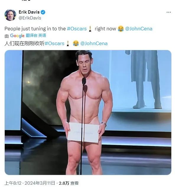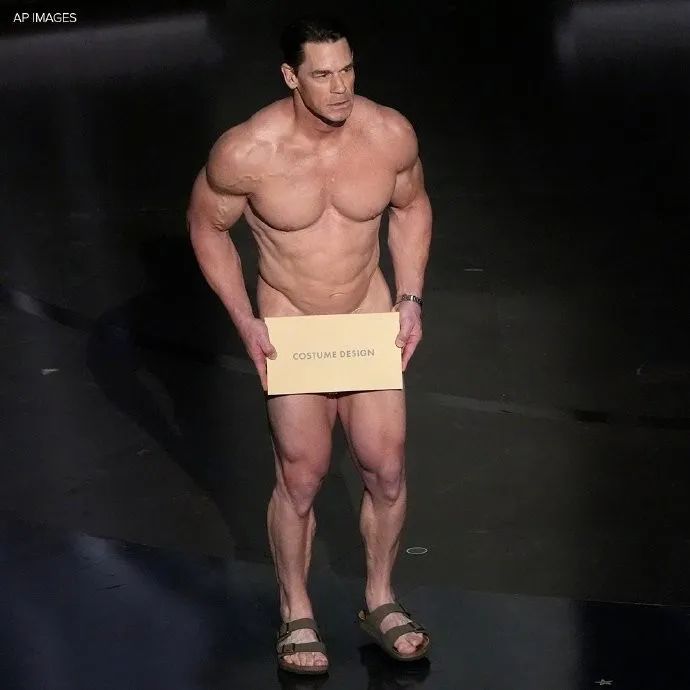 2024年第96届奥斯卡金像奖颁奖典礼进行中,男星约翰·塞纳(赵喜娜)全裸颁发最佳服装设计奖。这一奖项花落石头姐主演的电影《可怜的东西》。