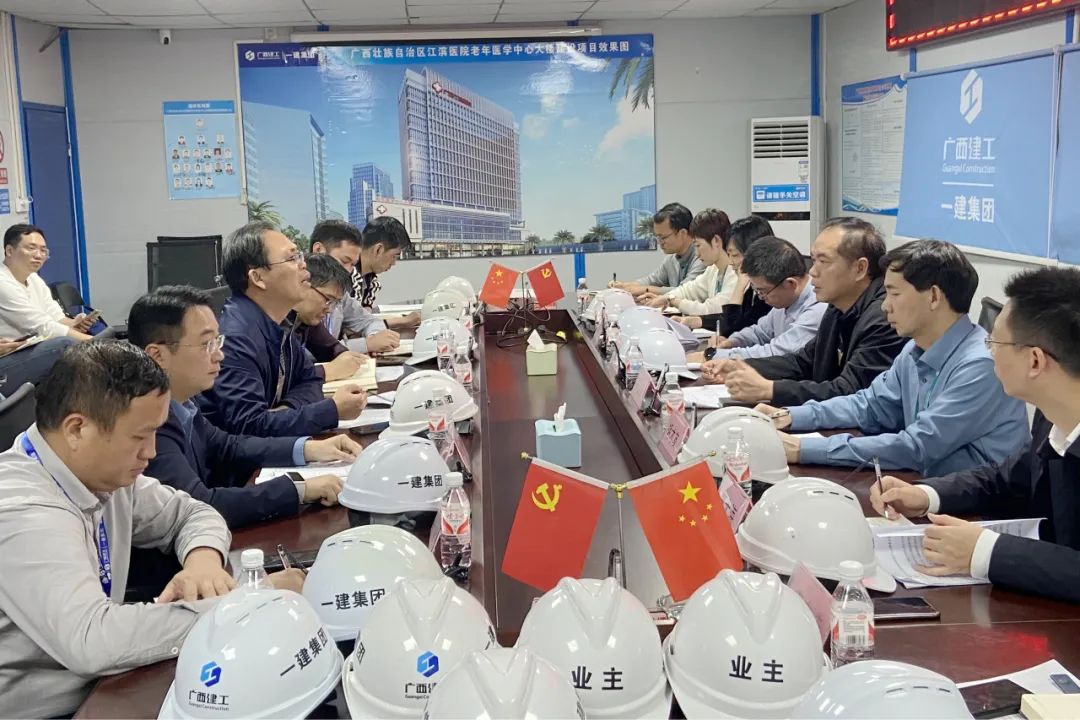 黄定贵深入项目现场,仔细查看项目质量、安全、进度等情况,充分肯定一建集团、广西江滨医院在合力快速推进项目建设方面取得的显著成效。会上,黄定贵认真听取各方情况汇报,了解项目建设进度和存在的困难,对项目建设过程中的材料进场、资金支付等痛点、堵点提出可行解决办法,协调明确各项问题解决的时间节点,对后续加快项目建设进度事宜提出宝贵的指导意见和建议。