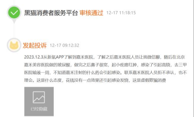 2023年12月3日,也有消费者投诉称:“从新氧APP了解到嘉禾医院,了解之后嘉禾医院人员让我微信聊,随后在北京嘉禾美容医院做的玻尿酸,做完之后鼻子很宽,起小疙瘩红肿,感染了引起高烧,去三甲医院输液一周,不知道嘉禾注射的什么药会引起感染。”