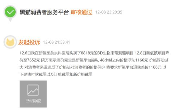 ▲ 图片来源于黑猫投诉2023年12月8日,另有消费者投诉称:“12月6日在新氧医美京科医院购买了8818元的3D生物束带紧缩项目,12.8日新氧该项目降价至7652元,院方表示控价完全是新氧平台操纵,48小时之内价格浮动1166元,价格浮动过大,对消费者来说违反了价格法对消费者的价格保护。”