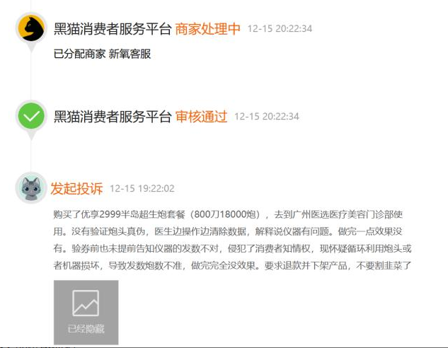 2023年12月15日,有消费者投诉称:“购买了新氧优享2999半岛超声炮套餐(800刀18000炮),去到广州医选医疗美容门诊部使用。没有验证炮头真伪,医生边操作边清除数据,解释说仪器有问题。做完一点效果没有。验券前也未提前告知仪器的发数不对,侵犯了消费者知情权,现怀疑循环利用炮头或者机器损坏,导致发数炮数不准,做完完全没效果。要求退款并下架产品,不要割韭菜了。”