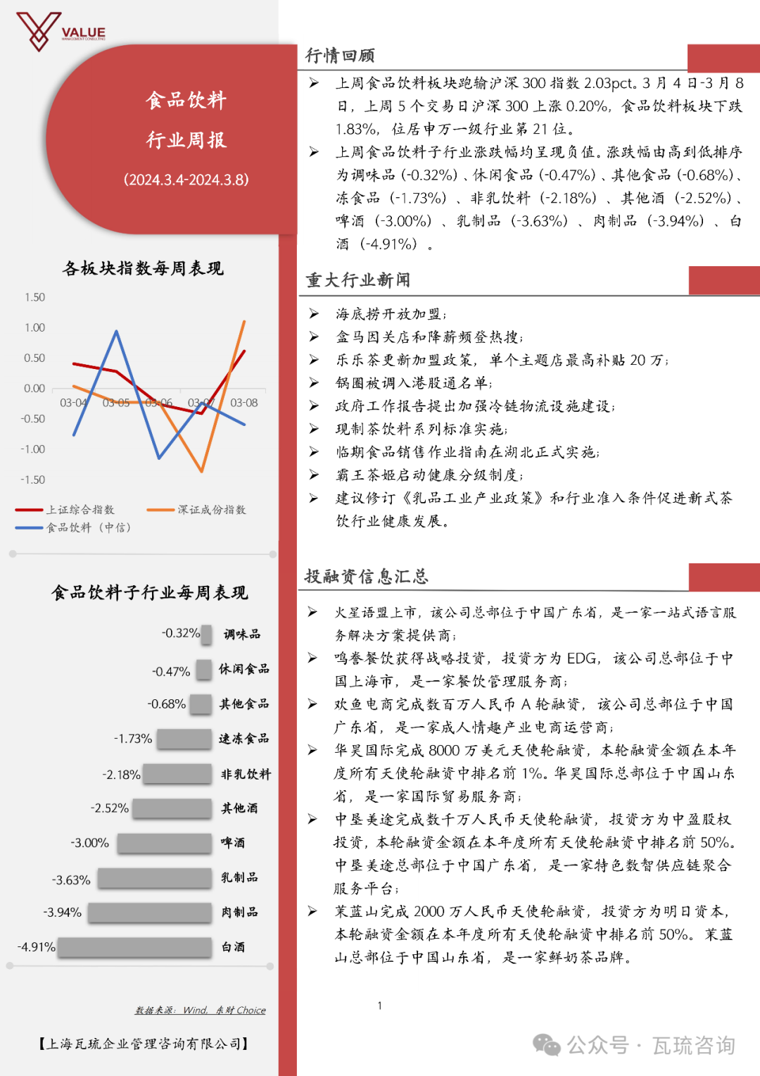 【瓦琉咨询】食品饮料行业周报(2024.3.4-2024.3.8)