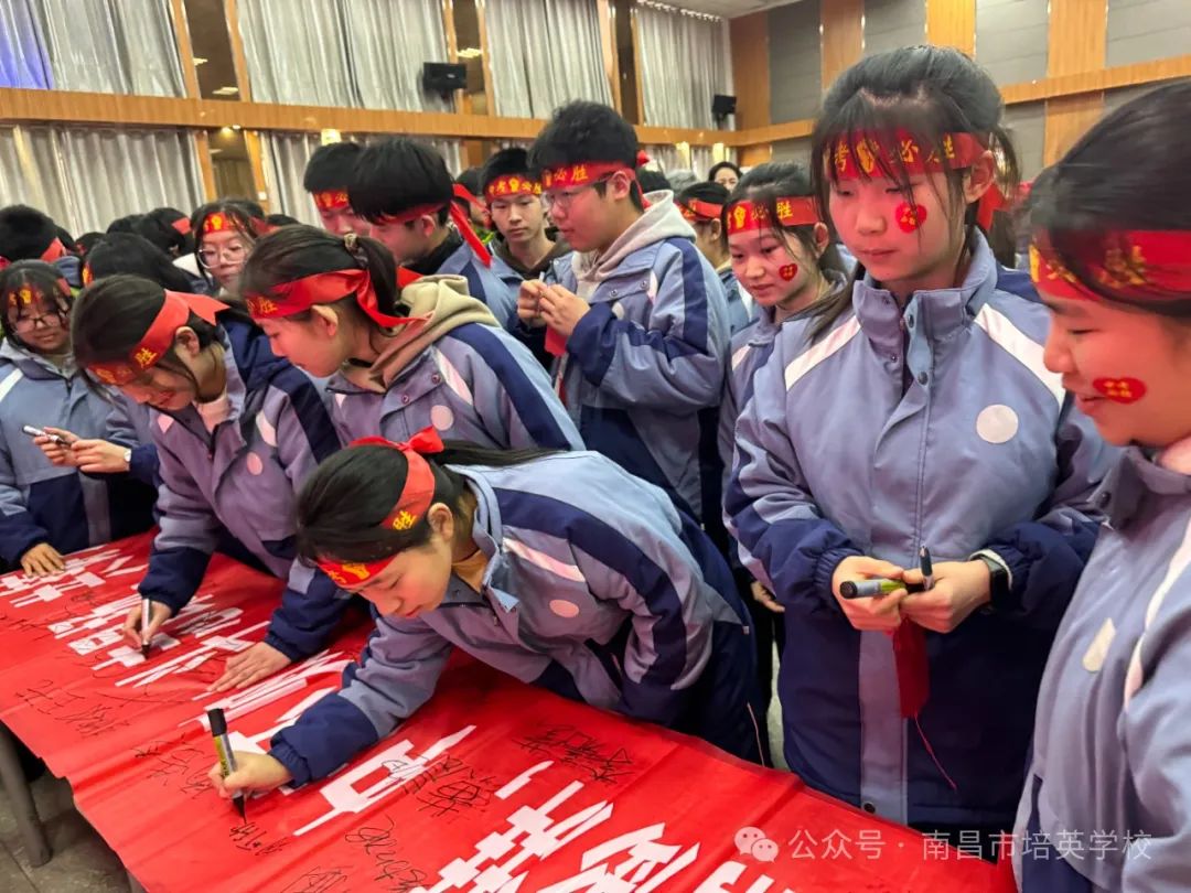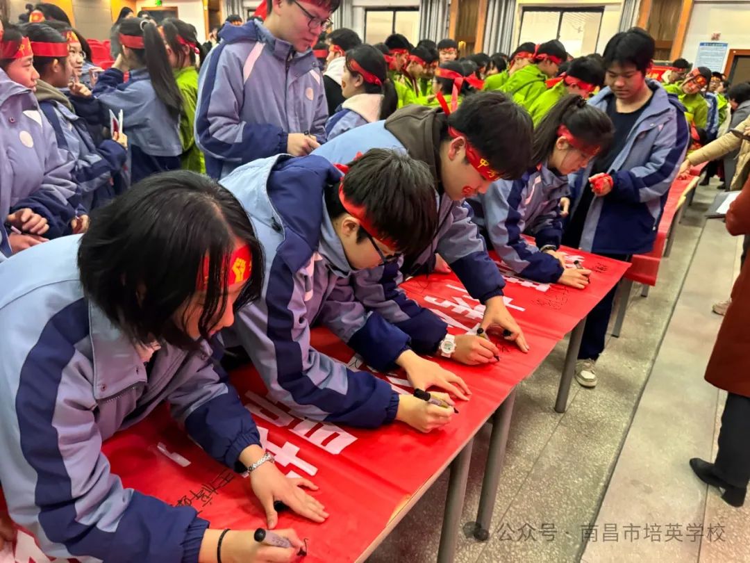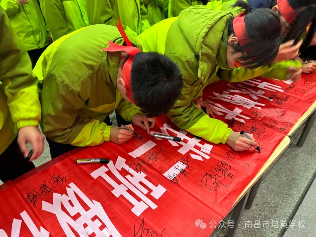 在师长们的祝福中,同学们进行了迎战中考的现场签名活动,在横幅上郑重地写下了自己的名字,期待一百天后金榜题名,梦想成真!