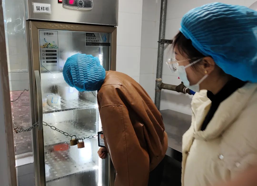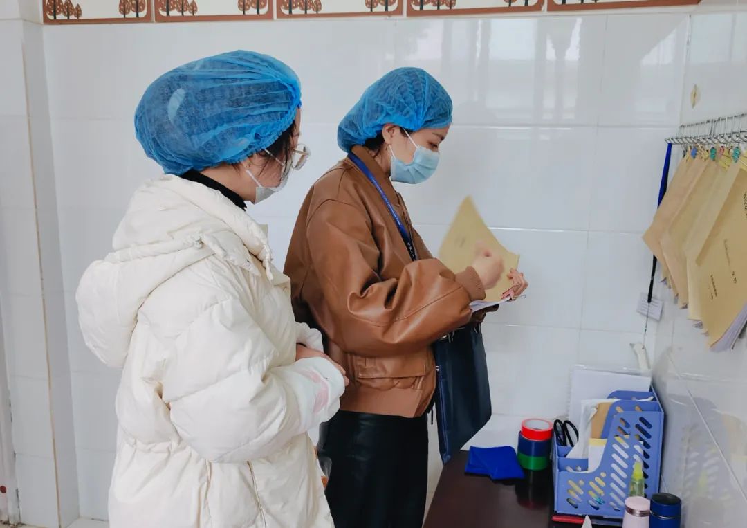 检查组在王锦老师的陪同下,实地查看了幼儿园食堂设施设备以及各操作间环境卫生、餐饮具清洗消毒保洁、仓库物品等安全卫生管理情况。细致查阅食堂管理各项制度、从业人员健康证、台账、留样记录等各项资料。