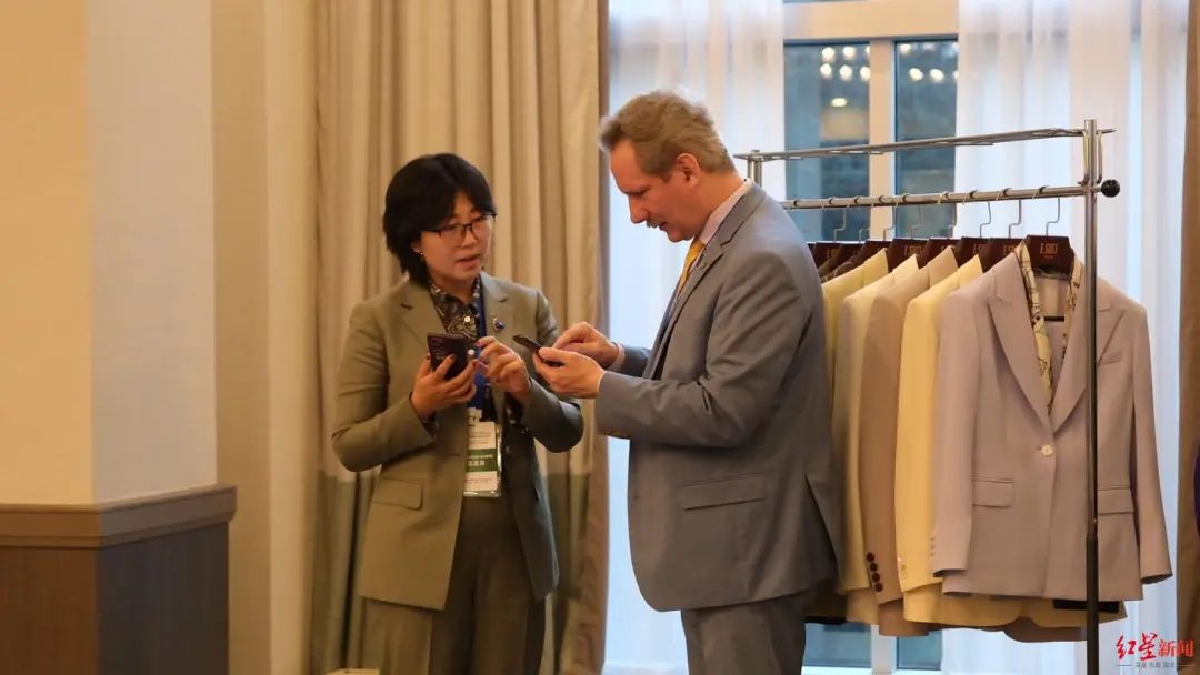 此次出行,丁媛媛是全团行李最多的人。她为了更好地向国际合作方展示产品,专程带了30多套正装出行。“每套西装都有不同的特色,比如有一件西装的扣子是用非遗技艺银花丝工艺制作的竹子样式,既展现了成都大熊猫的特色,也展示了成都的传统工艺。”