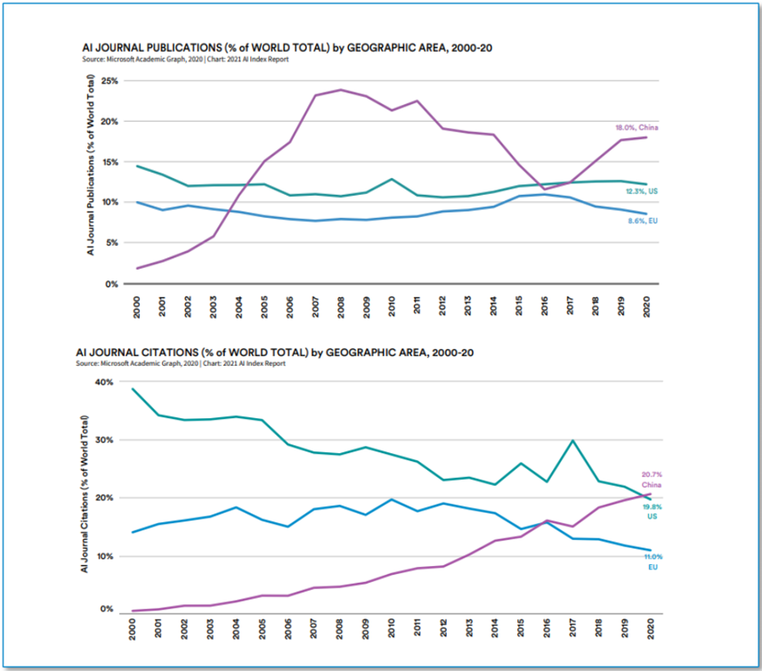 (1)各国纷纷从战略上布局人工智能,加强顶层设计和人才培养当前包括美国、欧洲和中国在内的多个国家,都将大力发展AI产业提升到国家战略层面。2019年2月,美国总统特朗普签署行政命令,正式启动美国人工智能计划,为美国首次推出国家层面的人工智能促进计划。欧盟于2018年发布《欧盟人工智能战略》,并计划在2020年底至少投入200亿欧元。中国方面,以2015年《中国制造2025》出台为开端,人工智能被写入“十三五”规划纲要及政府工作报告。2017年国务院发布《新一代人工智能发展规划》,将人工智能上升到了国家战略层面。随后多部门相继出台若干核心政策和规划,为我国人工智能行业快速发展提供助力。(2)中美领跑,中国人工智能人才数量快速增长,已发展成为人工智能大国近年来,中国人工智能人才数量快速增长,已发展成为人工智能大国。从发表论文和论文被引用的数量可以反映中国人才和技术研究能力与美国和欧洲相比的快速进步。根据斯坦福研究院Human-Centered AI发布的《2021年人工智能指数报告》,在三大人工智能强国(中国、美国和欧盟)中,中国的人工智能论文发表量和被引用量均居全球首位。2020年中国期刊发表数量以18.0%的比例超过美国(12.3%)和欧盟(8.6%)。