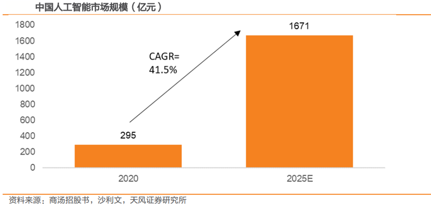 人工智能支出已经成为支持企业数字化转型支出的主力之一。随着数字经济发展,企业积极打造敏捷反应机制,推进精益化管理,提升组织创新能力,大力投资数字化转型相关技术,特别是在人工智能领域。人工智能支出已经成为支持企业数字化转型支出的主力之一。根据IDC数据,全球范围内,企业在包括硬件、软件和服务在内的人工智能(AI)市场的技术投资增速,将显著高于数字化转型(DX)支出和GDP增速。中国是全球人工智能第二大市场,预计增速有望全球第一。根据沙利文的报告,2020年中国人工智能市场规模为295亿元,预计2025年达到1671亿元,年复合增速为41.5%,其中软件市场规模占比将由2020年的9%提升至2025年的24.1%。