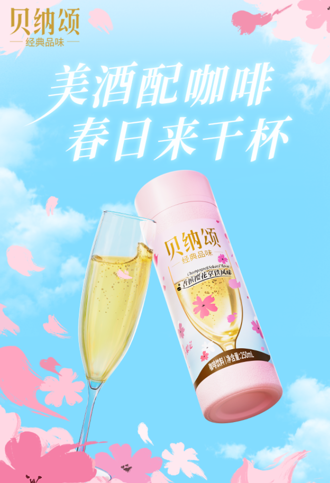 3月11日,据味全官微,贝纳颂香槟樱花拿铁上新,口味为香槟樱花风味。据称,该款咖啡不含酒精,仅香槟风味。