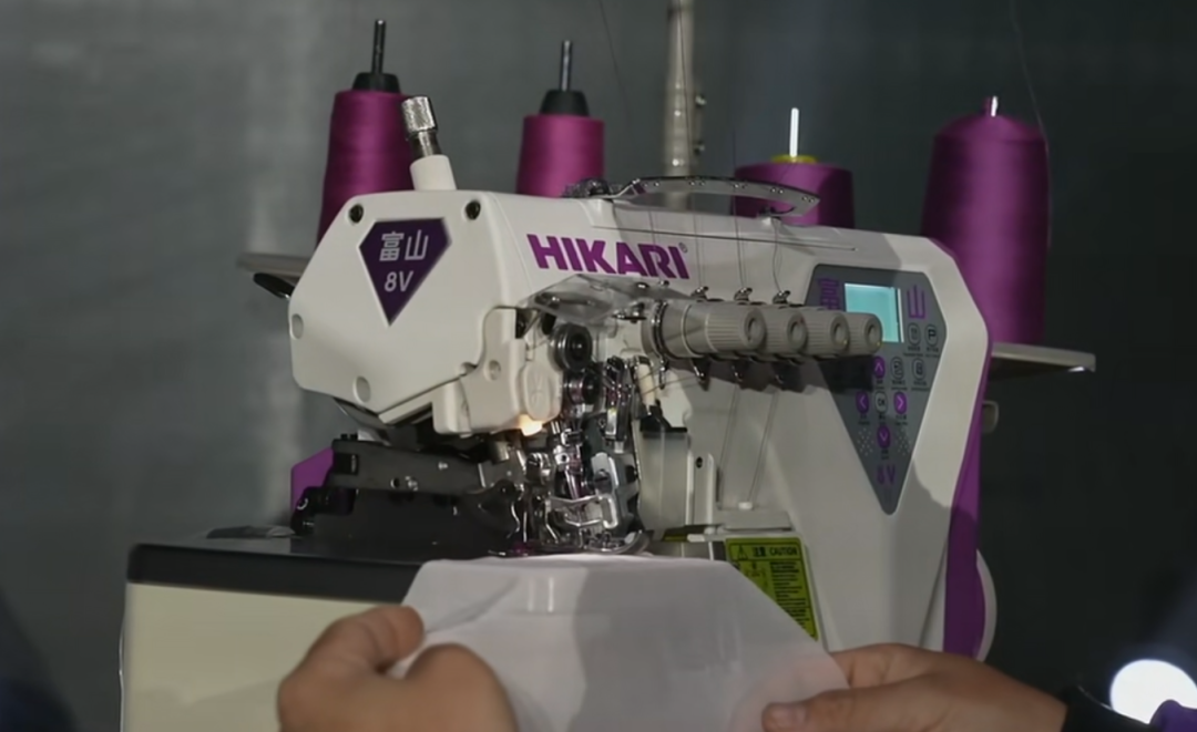 此外,富山新一代8V包缝机四线上下弯针过线孔数相比传统的四线包缝机减少了三分之一,使得线张力降低了40.4%,不仅大幅降低了断线几率,还保持了更美观的线迹。这是智能夹线技术在包缝机上的应用。