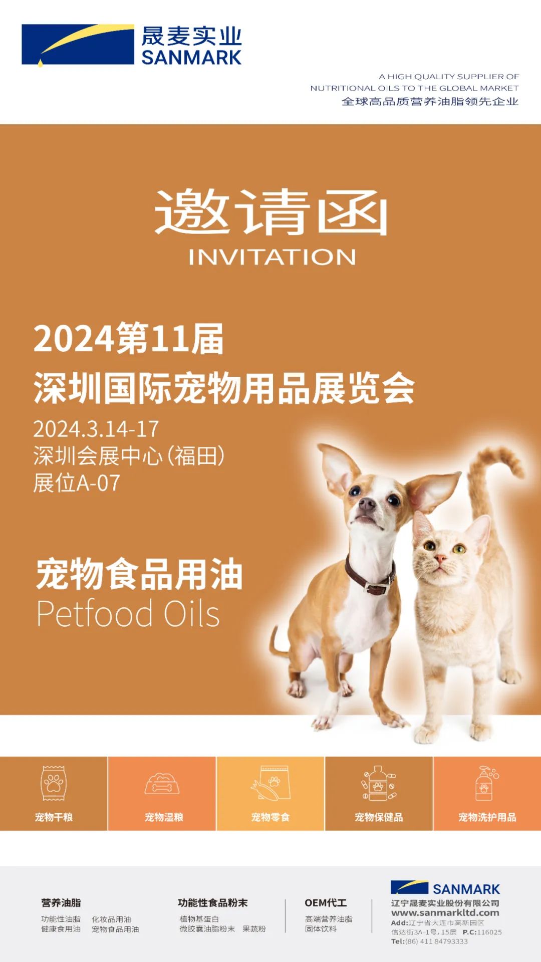 本次展会上,晟麦实业将重点展出宠物食品用油系列产品。晟麦宠物食品用油提取于天然植物种子。这些油脂中富含特定的功能因子,如α-亚麻酸(ALA)、γ-亚麻酸(GLA)、亚油酸(LA)、维生素等,在满足宠物食品适口性的同时,着力为宠物健康生长发育提供重要的营养支持。不同生长阶段的宠物,有着不同的健康问题和营养素需求。科学的选择和添加营养油脂,可以帮助呵护宠物健康,提升宠物生命质量。期待您的到来,我们真诚地期待与您并肩合作,为宠物带去更全面的健康保障,携手共创动物健康的美好未来!