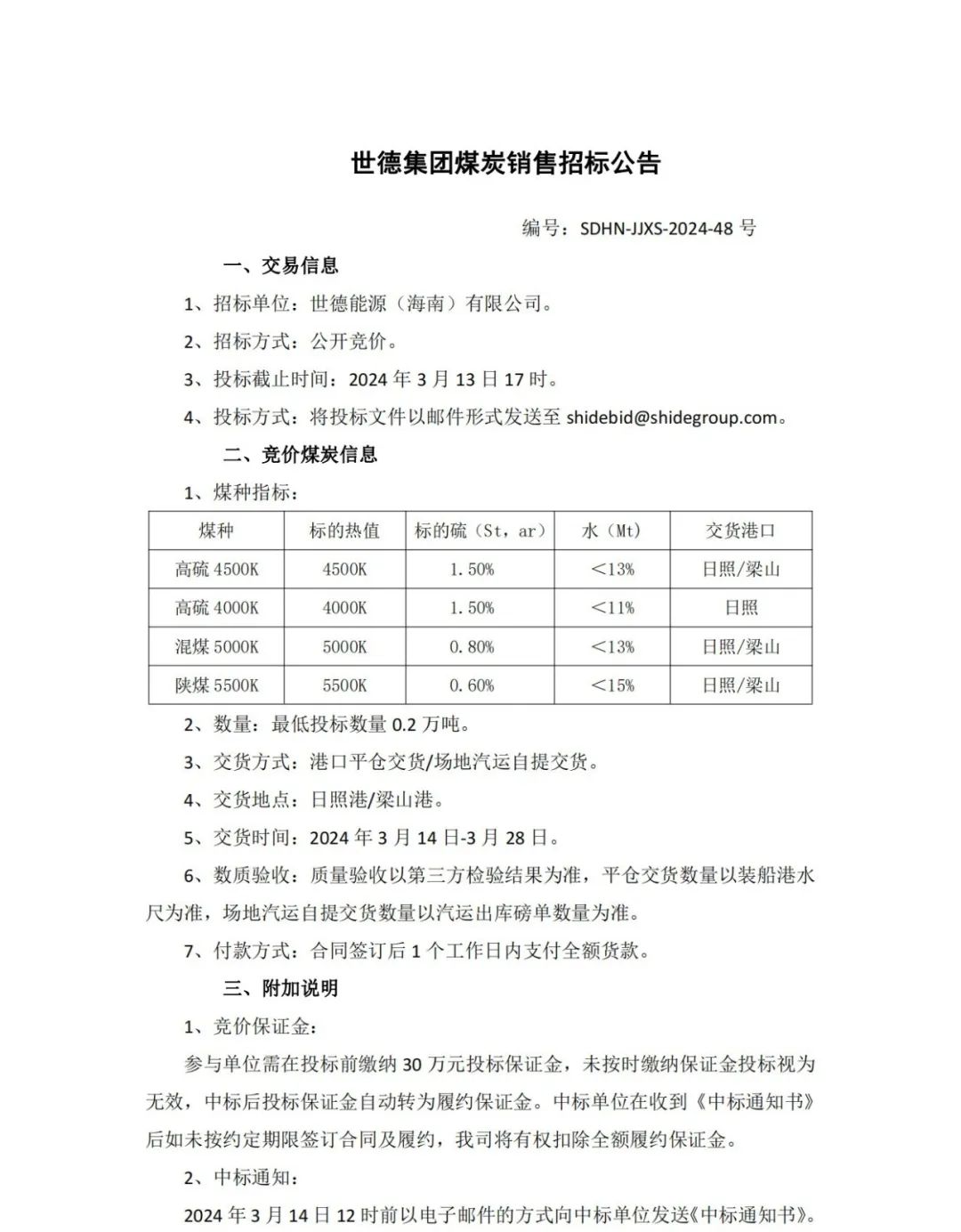世德集团煤炭销售招标公告(2024年3月13日)