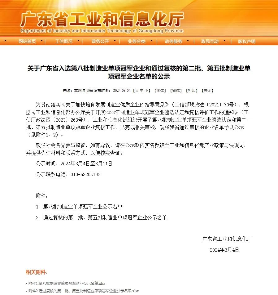 2024年3月4日,广东省工业和信息化厅公布了国家第八批制造业单项冠军企业名单,广东正业科技股份有限公司(以下简称:正业科技)凭借“锂电池X射线探伤检测设备”成功上榜。公司自主创新能力及产品实力获得国家级认可,高质量发展再添新佳绩。