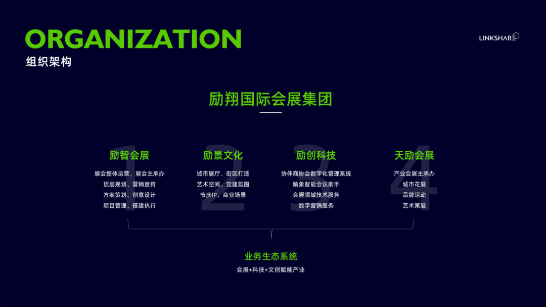 集团下设励智会展、励景文化、励创科技3家全资子公司和天励会展1家合资控股公司,分别专注于“会展整体服务、空间新场景打造、商协SaaS平台、花植产业会展”四大领域,经过12年耕耘,已成为国内一流的会展生态标杆企业之一。