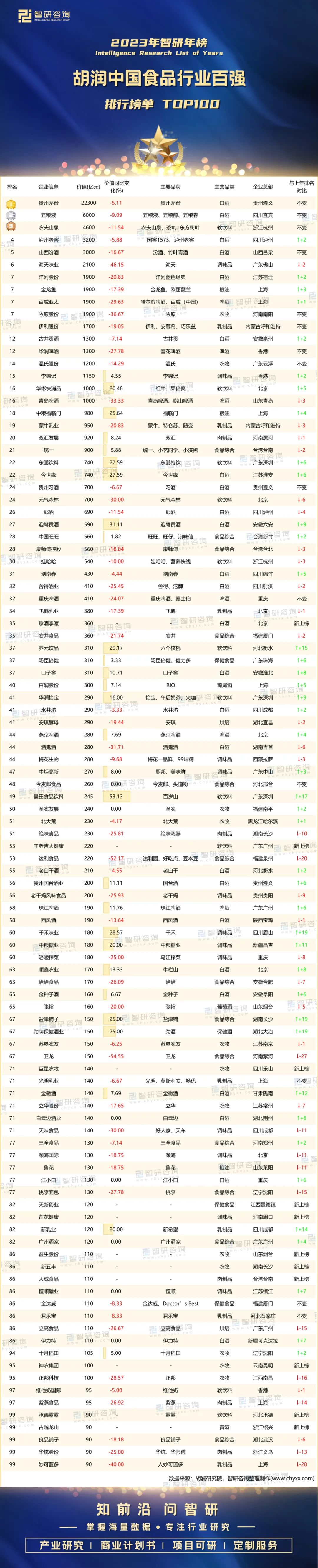 2023年胡润中国食品行业百强排行榜:张裕、鲁花、益生股份进入榜单