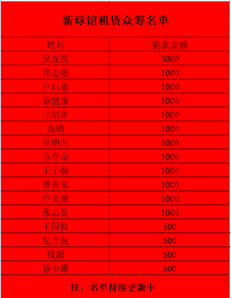 榕狮篮球队租赁新球馆众筹名单如下表: