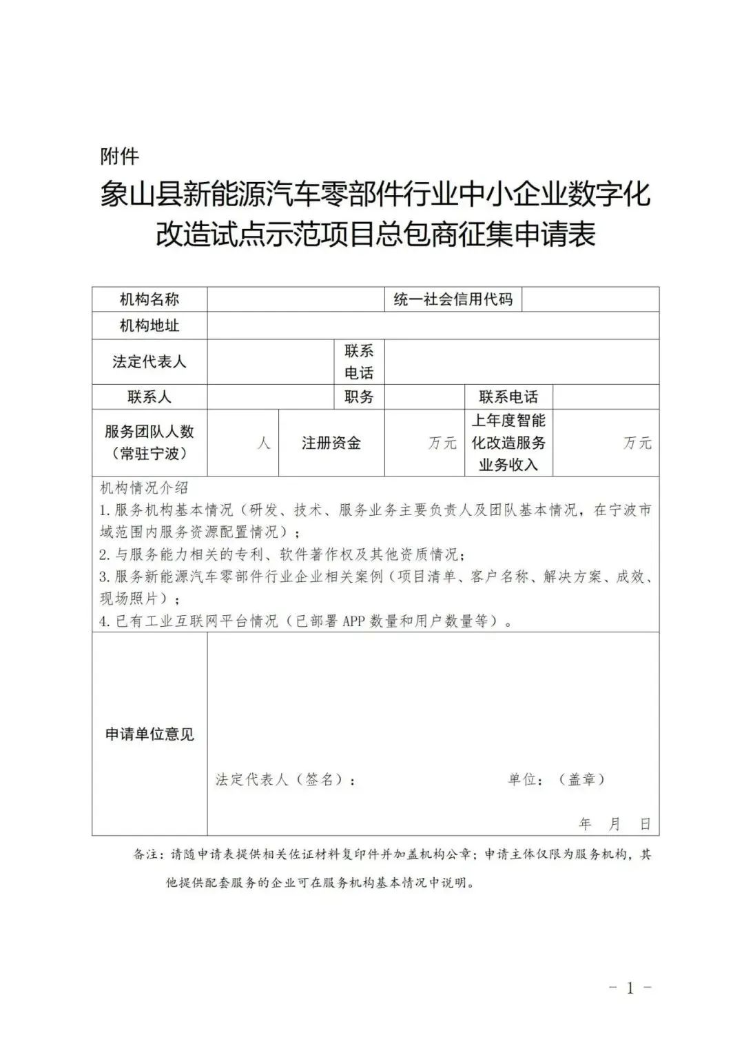 有意愿参与的服务机构,可于2024年3月15日(不含)前向县经信局提交《象山县新能源汽车零部件行业中小企业数字化改造试点示范项目总包商征集申请表》(详见附件)及相关附件资料(纸质资料一式五份,另须提供电子版文件),申请人须对申请材料真实性负责,经查实存在弄虚作假行为的,除取消申请资格外,将在县经信局网站上对相关情况进行通报。