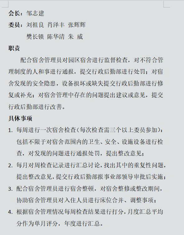 一直以来,基础施工机械公司都高度重视员工关爱,今年,公司立足于发展实际,着眼于员工需求,结合2023年宿舍管理情况,研究决定组建宿委会。经过自我推荐、择优遴选,确定了宿委会成员,并组织开展了宿委会工作会议。会议讨论通过了《宿舍管理委员会职责职能》、《宿舍周检查打分表》,重点强调了宿舍内务管理及禁止大功率电器的使用问题。进一步规范和改善员工住宿条件,从而提升员工爱寝、护寝意识。