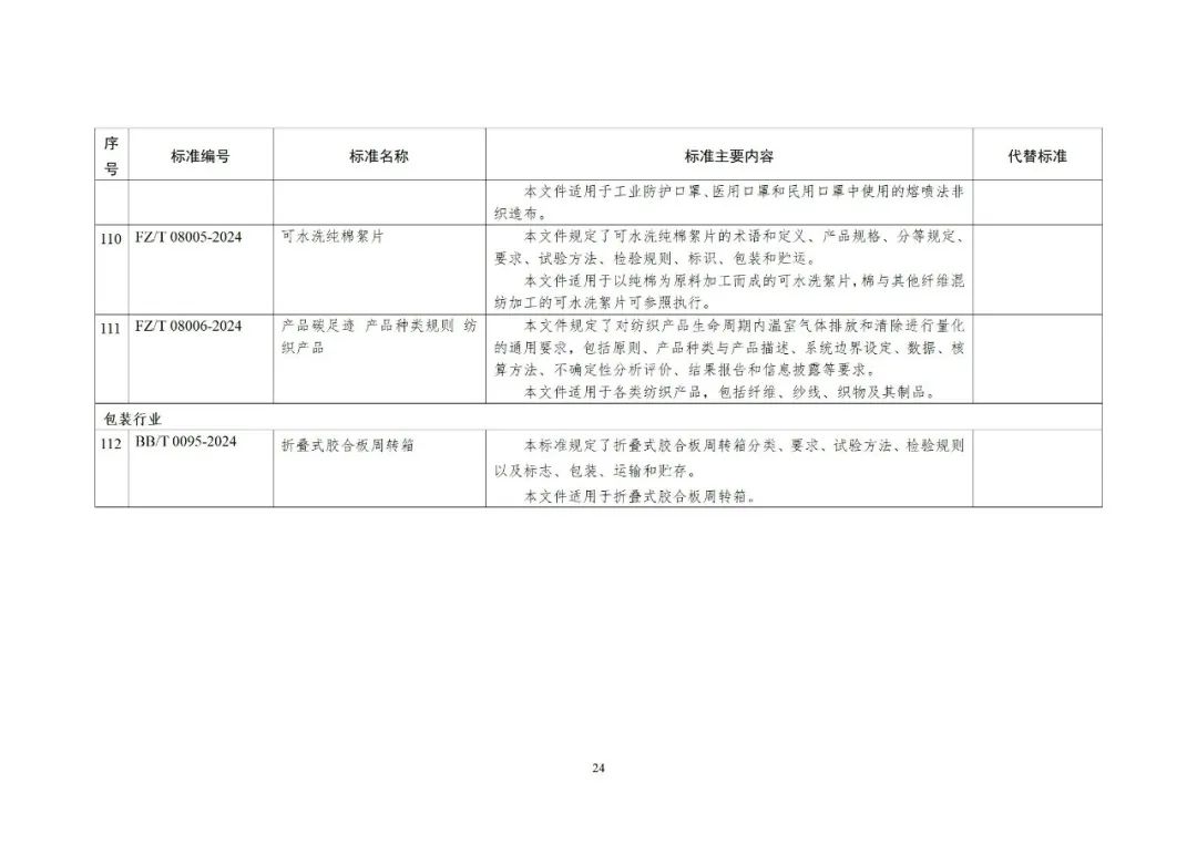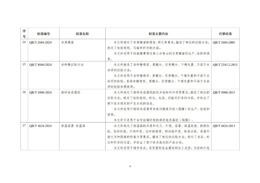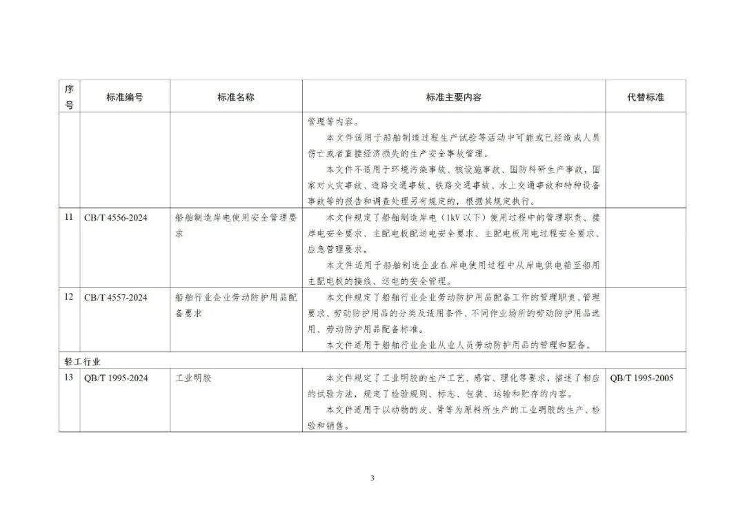 根据行业标准制修订计划,相关标准化技术组织已完成《船舶建造企业生产经营场所安全风险分级标示》等12项船舶行业标准、《工业明胶》等35项轻工行业标准、《纺织品 金属镀膜纤维鉴别方法》等64项纺织行业标准、《折叠式胶合板周转箱》1项包装行业标准的制修订工作及《造纸机械用铸铁烘缸》等4项行业标准外文版的编制工作。在以上标准及标准外文版发布之前,为进一步听取社会各界意见,现予以公示,截止日期2024年4月13日。