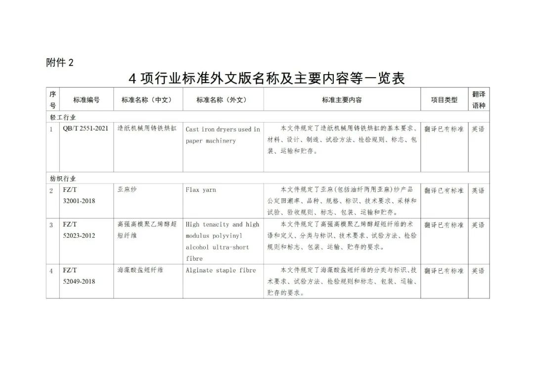 2. 4项行业标准外文版名称及主要内容等一览表