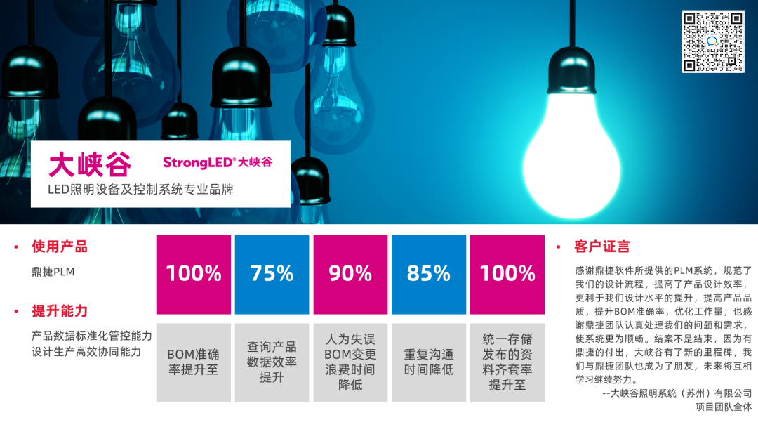 StrongLED大峡谷引入鼎捷PLM系统,帮助管理物料更方便,让物料的规格更一致、更规范,提高物料的重复使用率,控制物料数量的增长,降低管理成本。同时,通过系统,可以查找图纸和文件,提高工作效率。还可以把CAD设计工具和PLM系统连接起来,规范设计过程,提高设计效率,并且方便快速提取所需的物料清单。另外,系统还可以记录所有的变更,方便后期追溯,还能分析变更影响,避免遗漏细节。