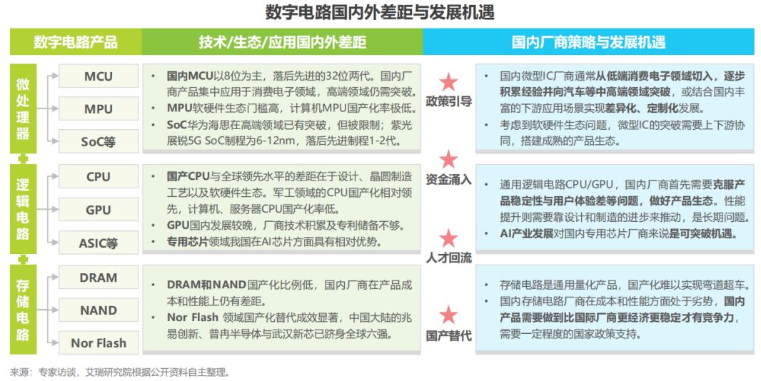 总览国内数字电路厂商的发展现状,在车规MCU、计算机MPU、通用CPU以及DRAM等高端数字电路领域,国内厂商依然处于初步发展阶段,存在技术落后、产品生态不完善等问题。但国内厂商在低端应用领域的探索为突破高端积累了经验,依托国内IC产业基础,外加IC人才归国潮以及政策资金支持等红利,国内厂商可在稳固低端市场的同时循序渐进,突破先进制程与高端应用领域。