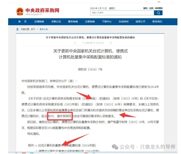 1、中央国家机关政府采购中心2024年3月11日发布《关于更新中央国家机关台式计算机、便携式计算机批量集中采购配置标准的通知》。