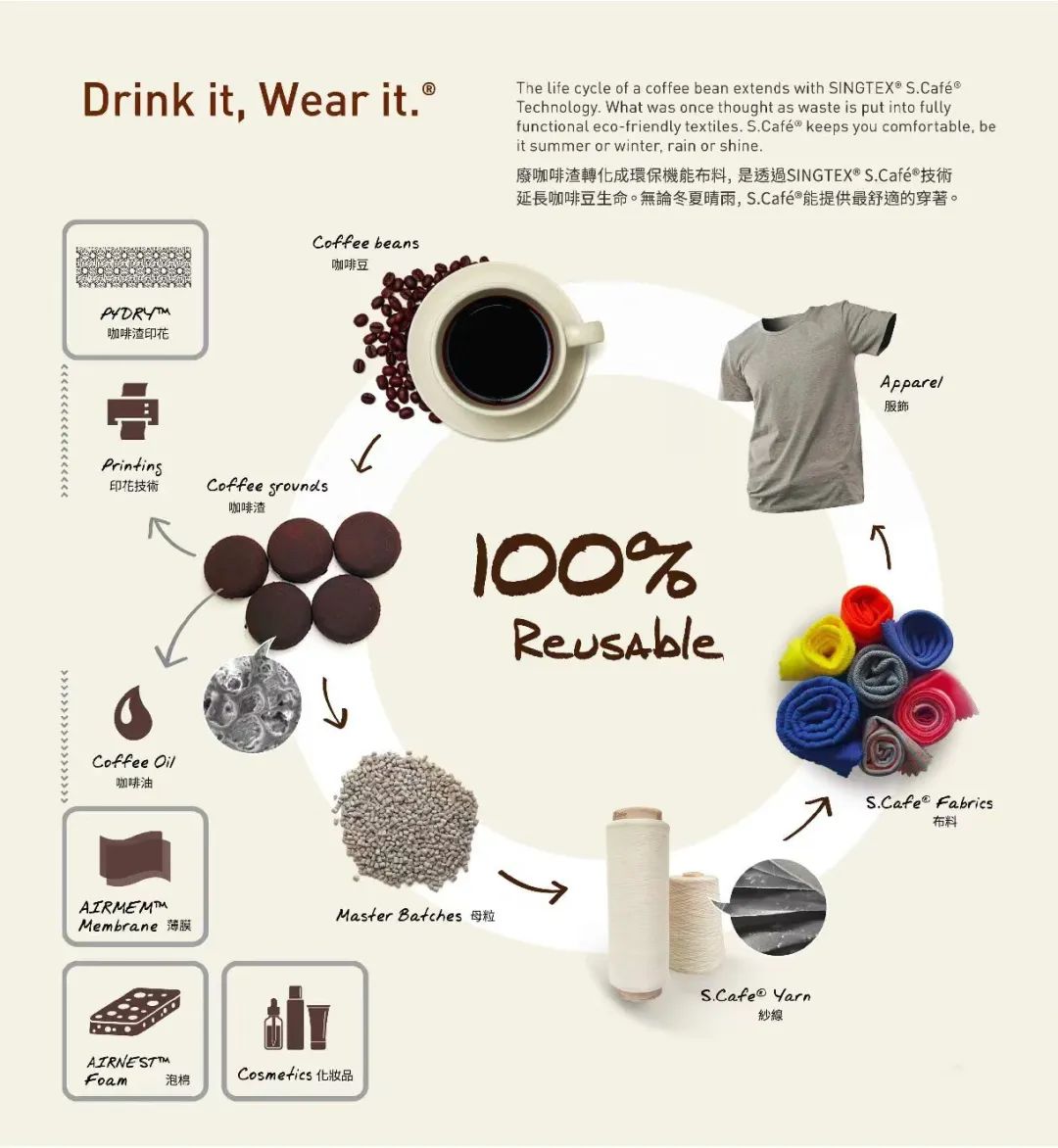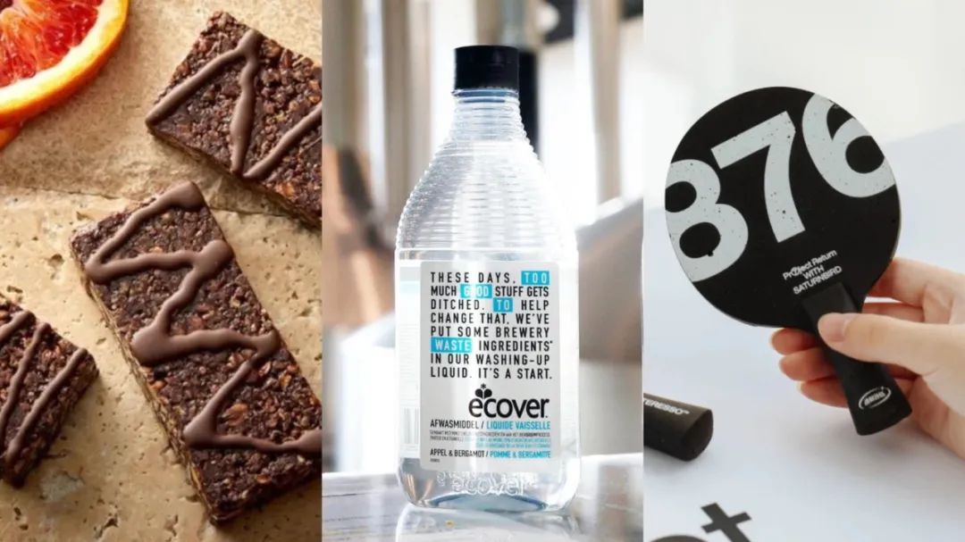 无醇啤酒的风越来越大,从啤酒里取出的酒精要怎么办呢?也许有一天,可以用它来洗碗?不是开玩笑,你熟悉的百威英博联合比利时Ecover真的把酒精做成了洗洁精。从咖啡豆到一杯咖啡,打开了广阔的风味,但也有 99.8%是废弃掉的原料,就是咖啡渣。三顿半通过混合配比咖啡渣,经过配方和模具调试,制作出占比达到65%的高纯度咖啡渣材料,并将材料用于回旋镖制作。[10]三顿半将咖啡渣制作成大尺寸板材,替代海洋板使其成为支撑台面。三顿半还用回收来的咖啡渣做了一组mini乒乓球拍,意在让大家轻松玩起来,循环再生值得纪念,回归生活也同样重要。1989年成立的中国台湾羊毛供应商SINGTEX,创新地将咖啡渣融入纱线,打造出一款环境友好的专利纱线—S.Café®,这款专利产品在快速排汗、快干以及防紫外线方面,都有令人羡慕的功能性。咖啡生豆供应商Olam Coffee通过回收咖啡果肉制作出了天然食品添加剂。可用在茶、面粉、果酱、果冻、甜点浇头、面包馅料等食品加工中。Cascara使用被扔掉的咖啡果干壳酿造成了茶,这种茶富含咖啡因还有水果的味道。咖啡渣还能作清洁的生物能源,英国GroCycle2011年开始用咖啡渣种平菇,上百磅咖啡渣被收集起来种植平菇。美国升级再造原料供应商Renewal Mill将生产豆奶、燕麦奶等产品的副产物—“豆渣”进行收集、脱水、干燥、研磨成粉,用于制作面粉和烘焙甜品。美国Pulp Pantry把蔬菜榨完汁后的大量果肉(果渣)转化成了营养丰富、口味多样的薯片。Spare