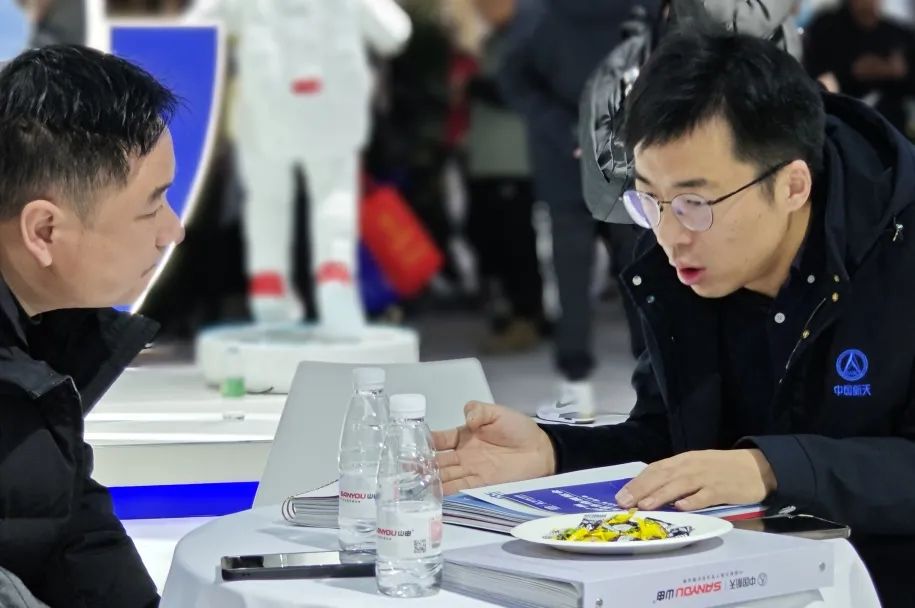 航天山由工作人员同观展商洽谈