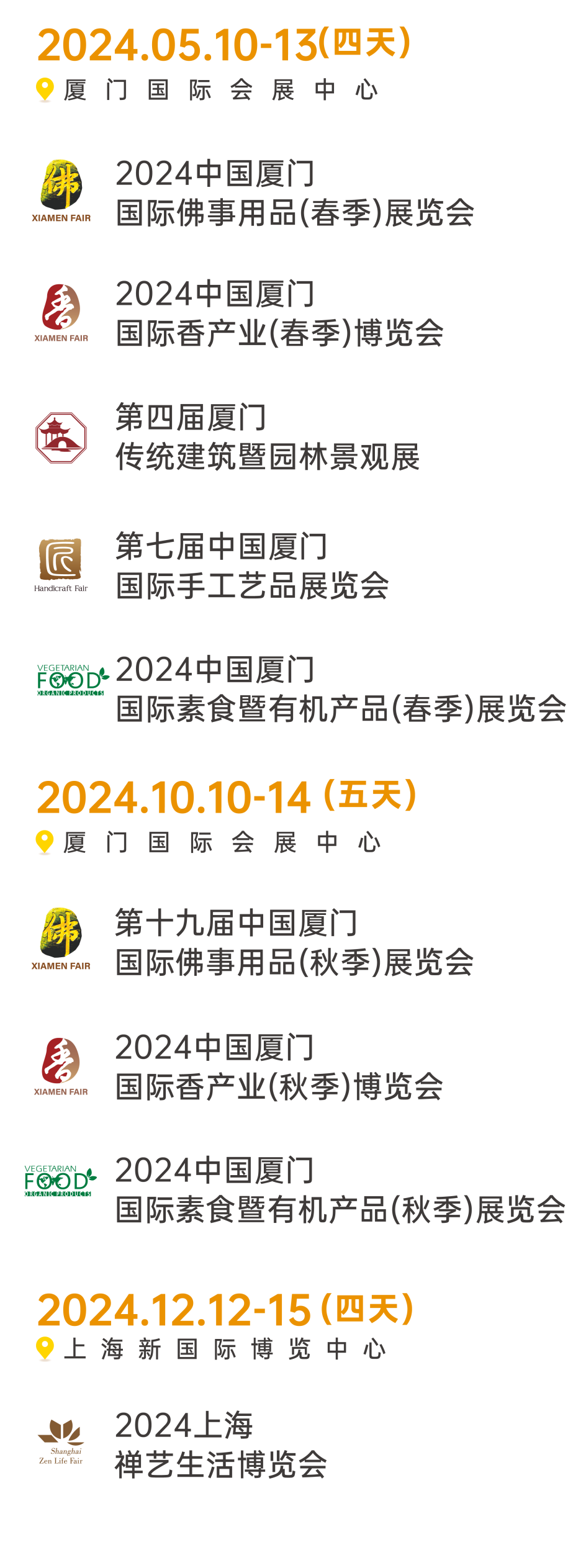 展会同期举办厦门建筑暨园林景观展、厦门香博会、厦门素食展、厦门手工艺品展,多展联合,串联起完整的佛事用品产业链资源,链接更多上下游企业,更具看点。