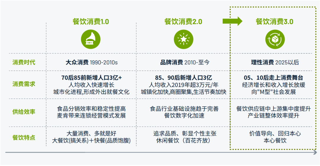 ,这标志着餐饮3.0时代的出现。在这个时代,消费者更加注重价值导向,关注餐饮行业的社会责任和可持续性发展,回归本心成为他们的选择准则,将餐饮行业推向更加健康、可持续的方向。