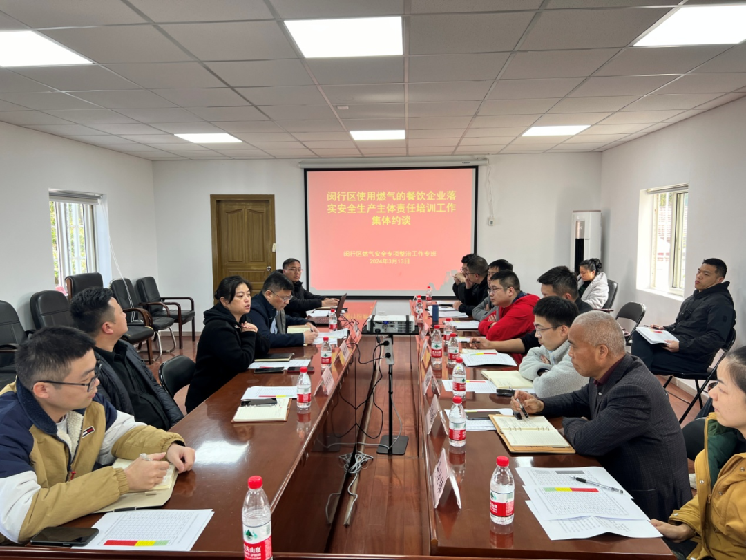3月13日,闵行区城镇燃气安全专项整治工作专班召开使用燃气的餐饮企业落实安全生产主体责任培训推进会议,区专班办公室副主任、区建管委副主任俞奕华,区经委、相关街镇燃气整治专班负责人参加会议。
