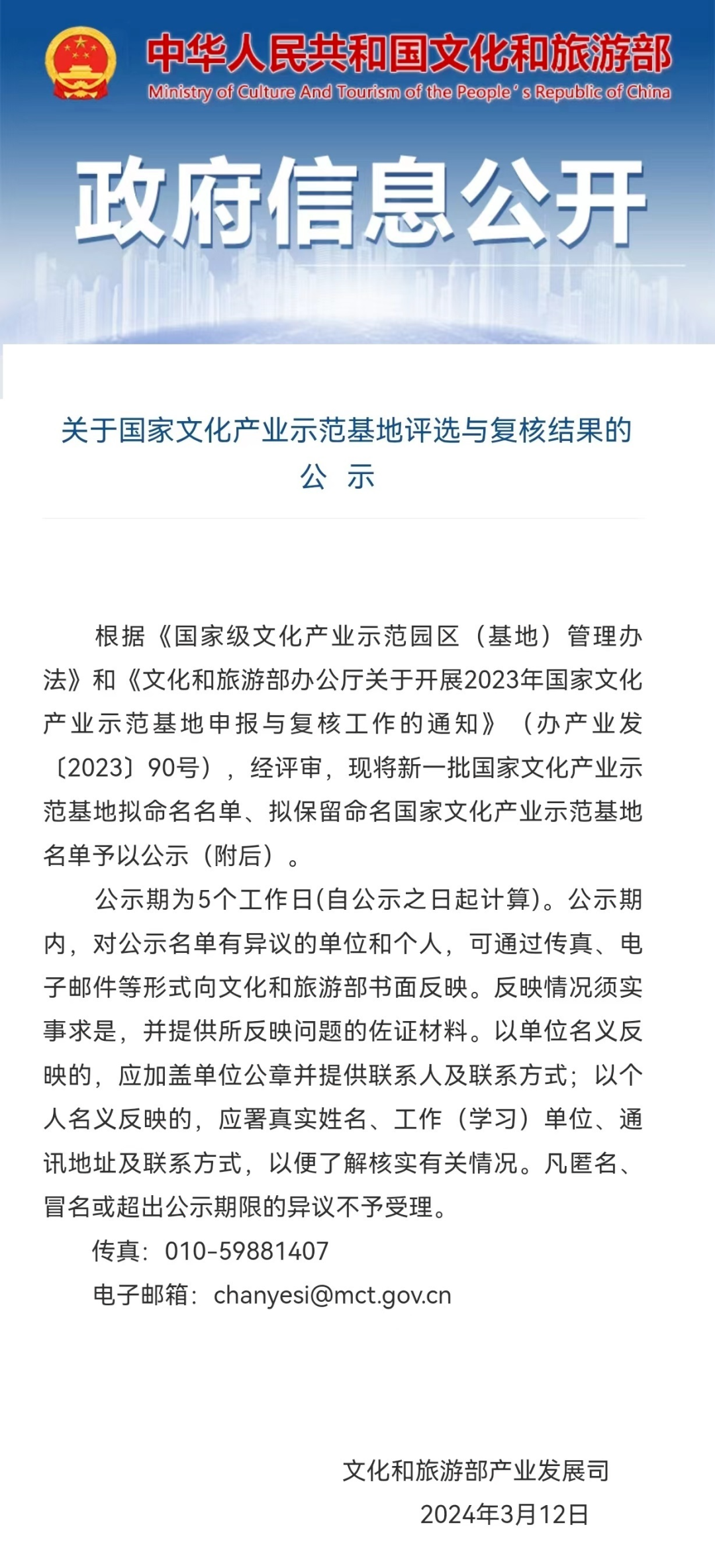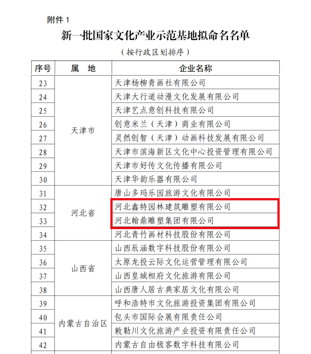 3月12日,文化和旅游部官方网站发布了《关于国家文化产业示范基地评选与复核结果的公示》。河北省4家企业入选新一批国家文化产业示范基地拟命名名单,我县独占2家,分别是河北鑫特园林建筑雕塑有限公司、河北翰鼎雕塑集团有限公司。