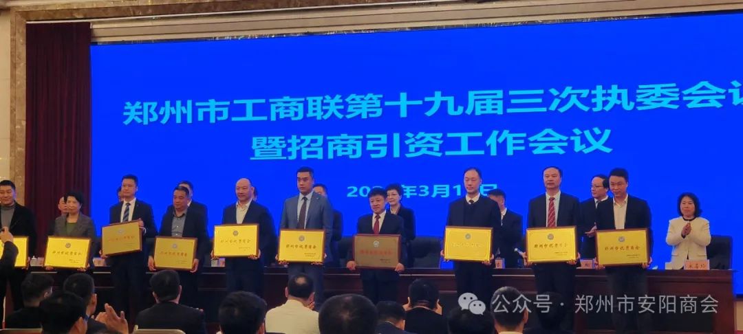 3月13日,郑州市工商联在郑州市紫荆山宾馆召开郑州市工商联十九届三次主席会议、二次常委会议和三次执委会议暨招商引资工作会议。会上,对2023年度商会进行表彰,郑州市安阳商会