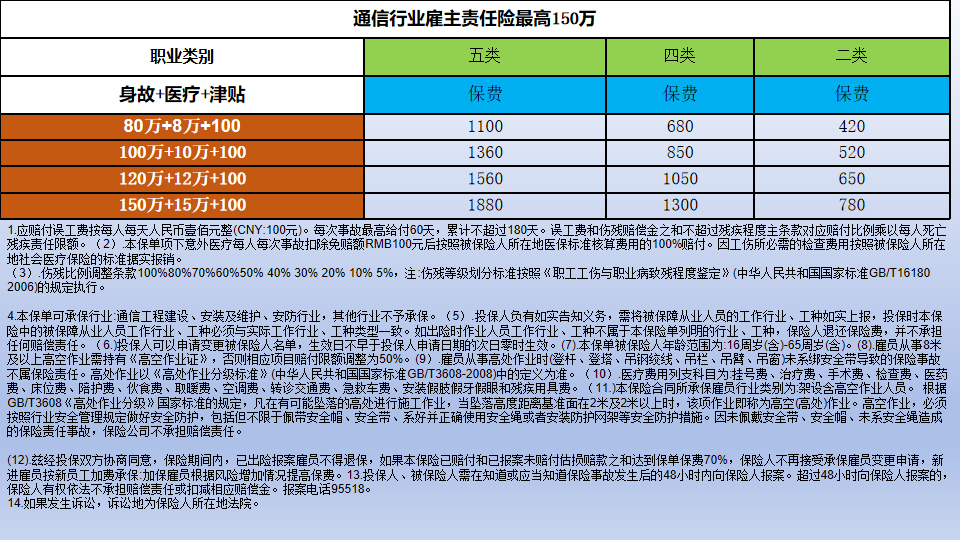 5.本保单可承保行业: 通信工程建设、安装及维护、安防行业,其他行业不予承保。