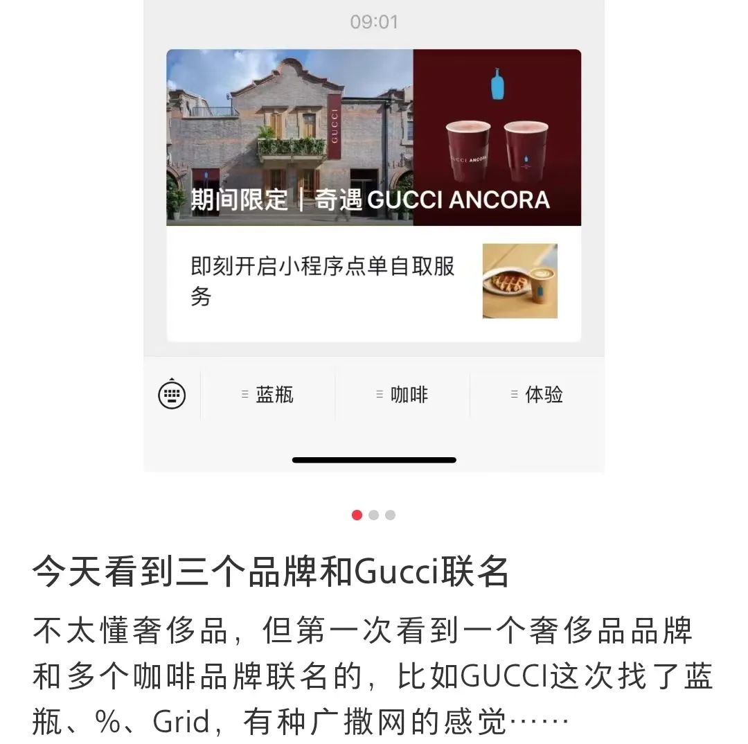 但也有网友认为这三家咖啡品牌和Gucci可能只合作这么一次,因为Gucci联名合作开设的快闪店都距离Ancora系列展览场所不远,购买咖啡的消费者兴许会被显眼的展览馆吸引目光,从而进场参观并了解Ancora系列。