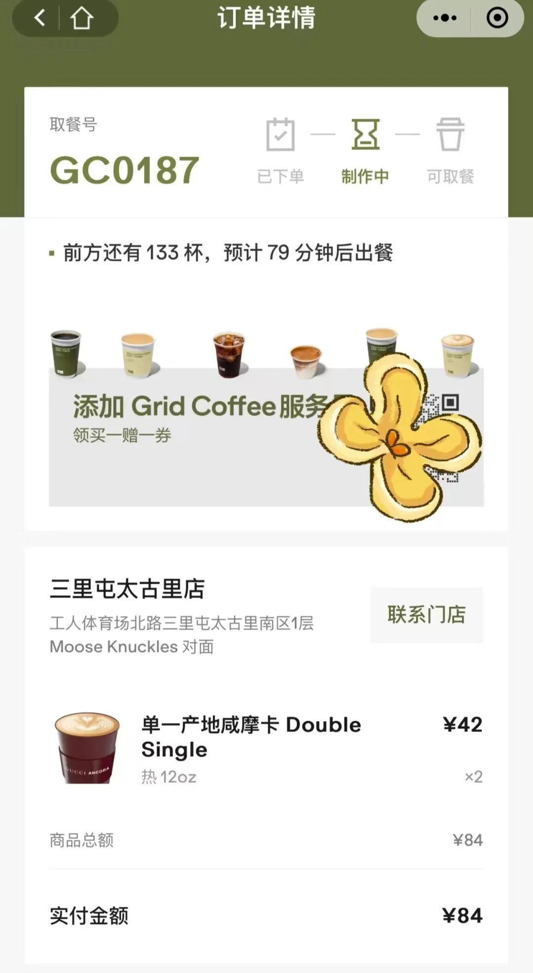据悉,消费者可以在北京三里屯的Grid coffee、上海蓝瓶咖啡张园店、深圳万象城的%Arabica,成都太古里的%Arabica这四家限定快闪店购买到Gucci咖啡。门店、时长、产品的三重限定营造出一种“机不可失”的氛围,以至于消费者们生怕错过这杯限定咖啡,活动一上线便前去排队购买。