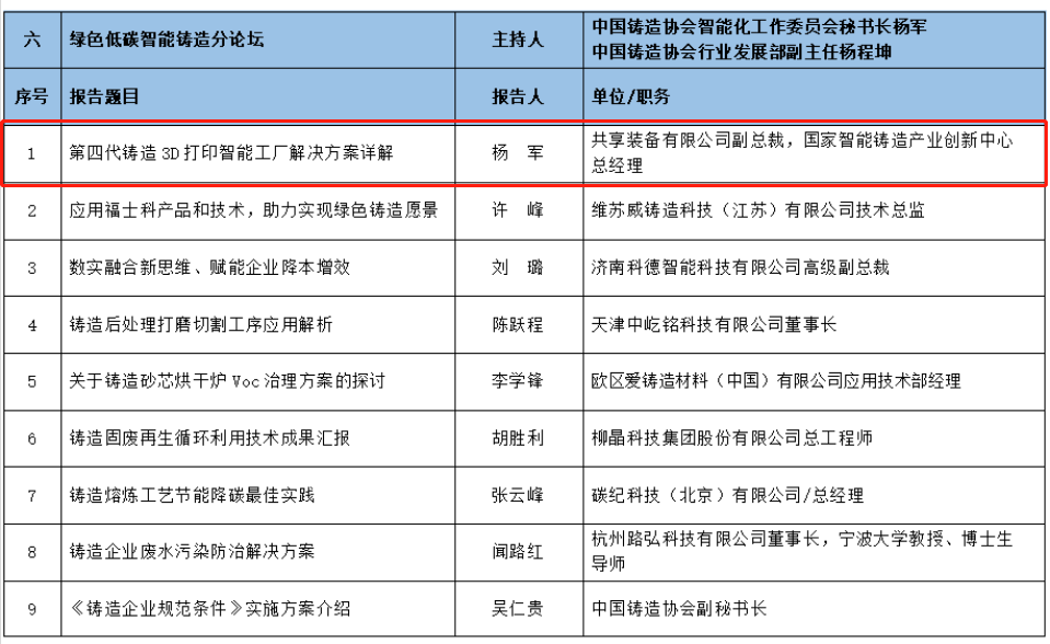 5月11日下午,在绿色低碳智能铸造分论坛中,中国铸造协会智能铸造工作委员会秘书长、共享装备股份有限公司副总裁、国家智能铸造产业创新中心总经理杨军,将以”第四代铸造3D打印智能工厂解决方案“为题作报告分享。