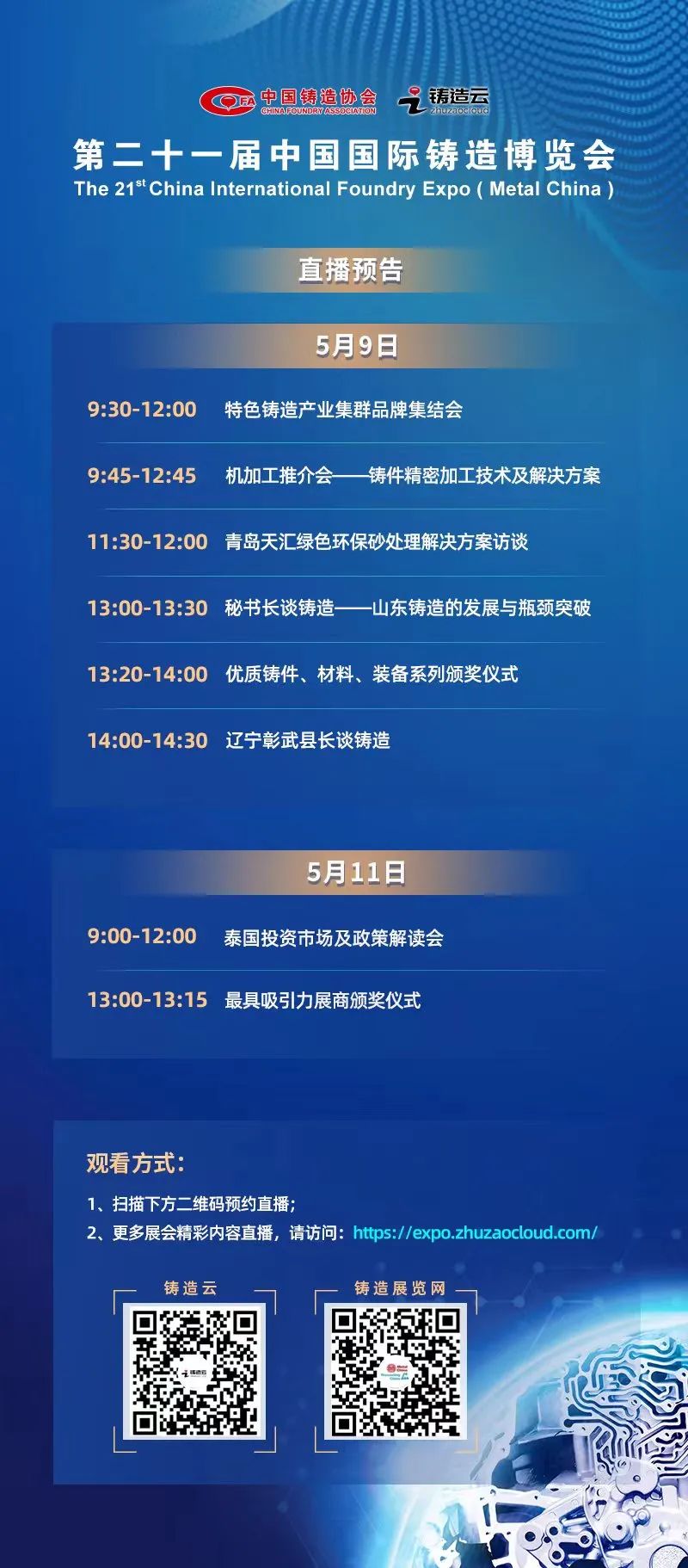 5月9日上午11:10,我们将通过国家智能铸造产业创新中视频号直播,对本次参展产品做详细介绍,点击下方预约直播,精彩不错过。