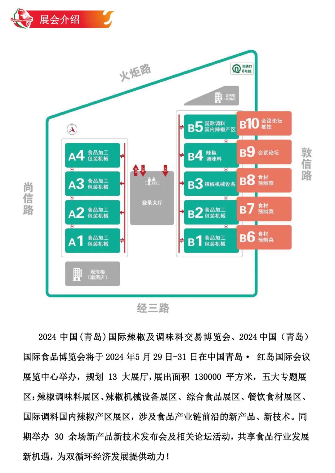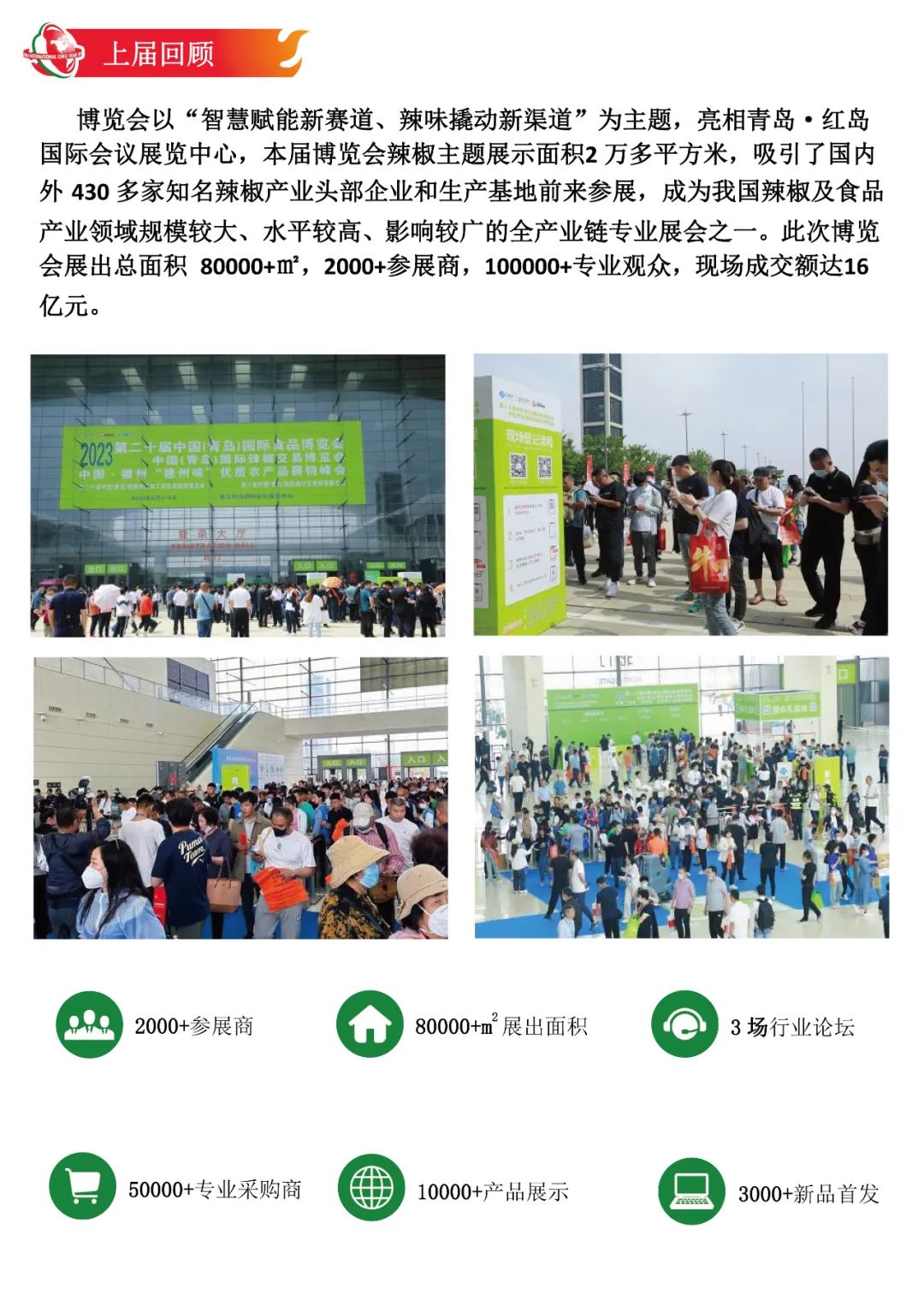 2024 年 5 月 29 日,“中国(青岛)国际辣椒及调味料交易博览会”与“中国(青岛)国际食品博览会”、“良之隆·中国鲁菜食材电商节”将共聚青岛·国际会展中心,三方共同合作,强强联合,再创新高。合力打造更高质量、更具影响力的大型行业展会。展会总规模逾13万㎡,参展商超2000家,展出品种超10000+,预计将有来自全国各地的10万余专业观众到场参观采购。