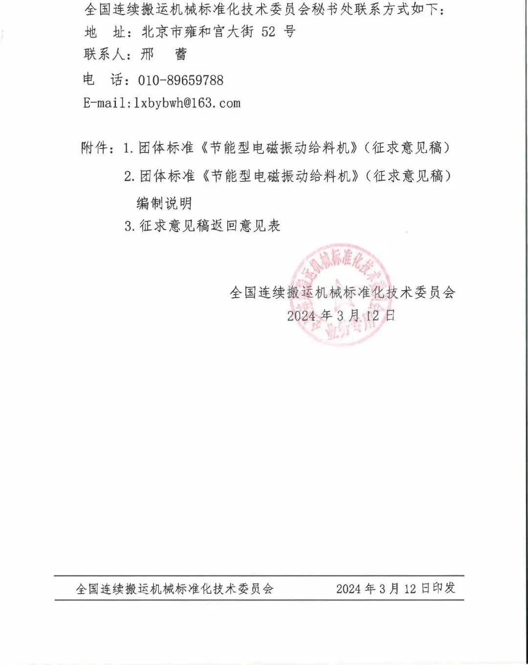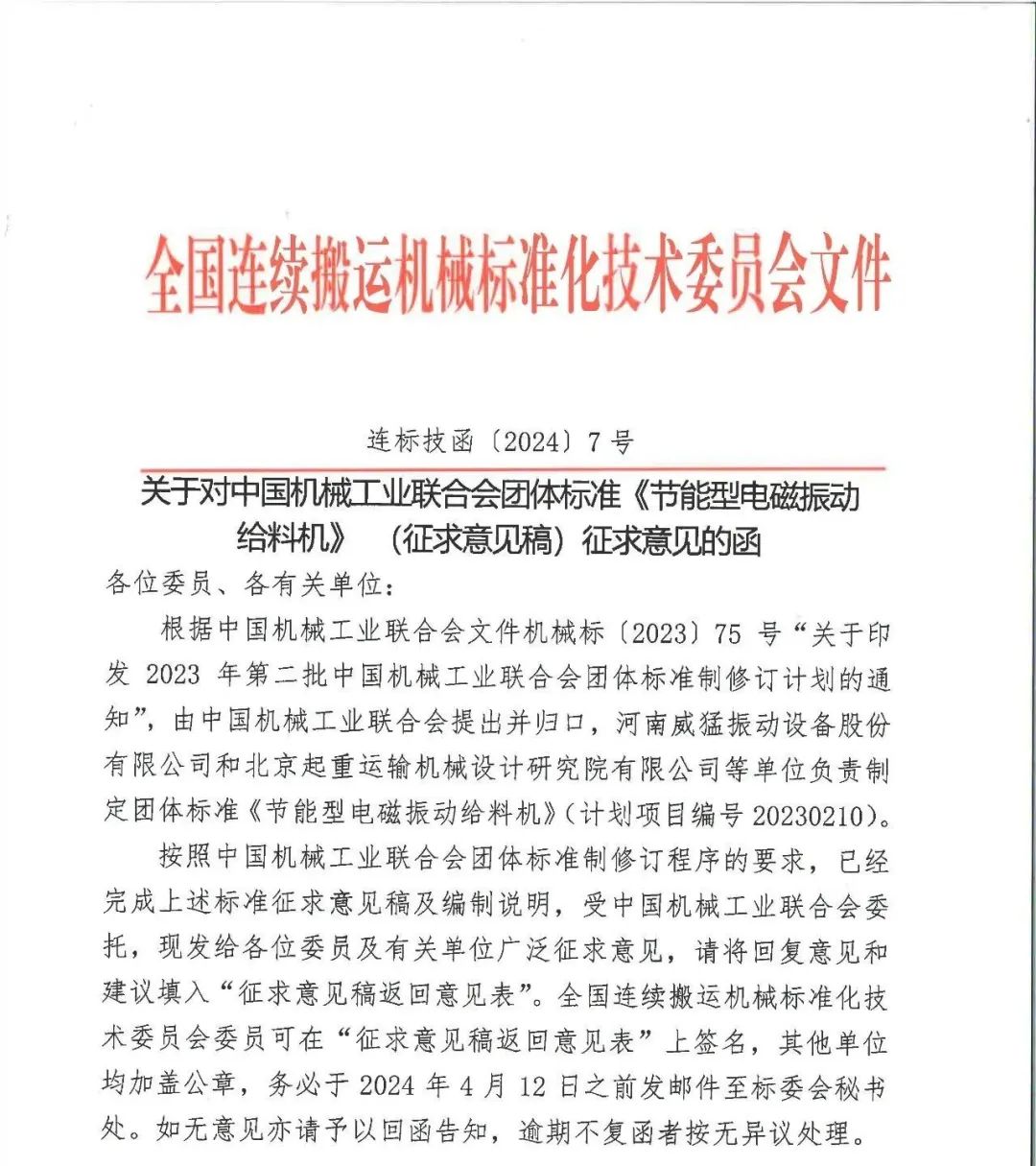 关于对中国机械工业联合会团体标准《节能型电磁振动给料机》(征求意见稿)征求意见的函