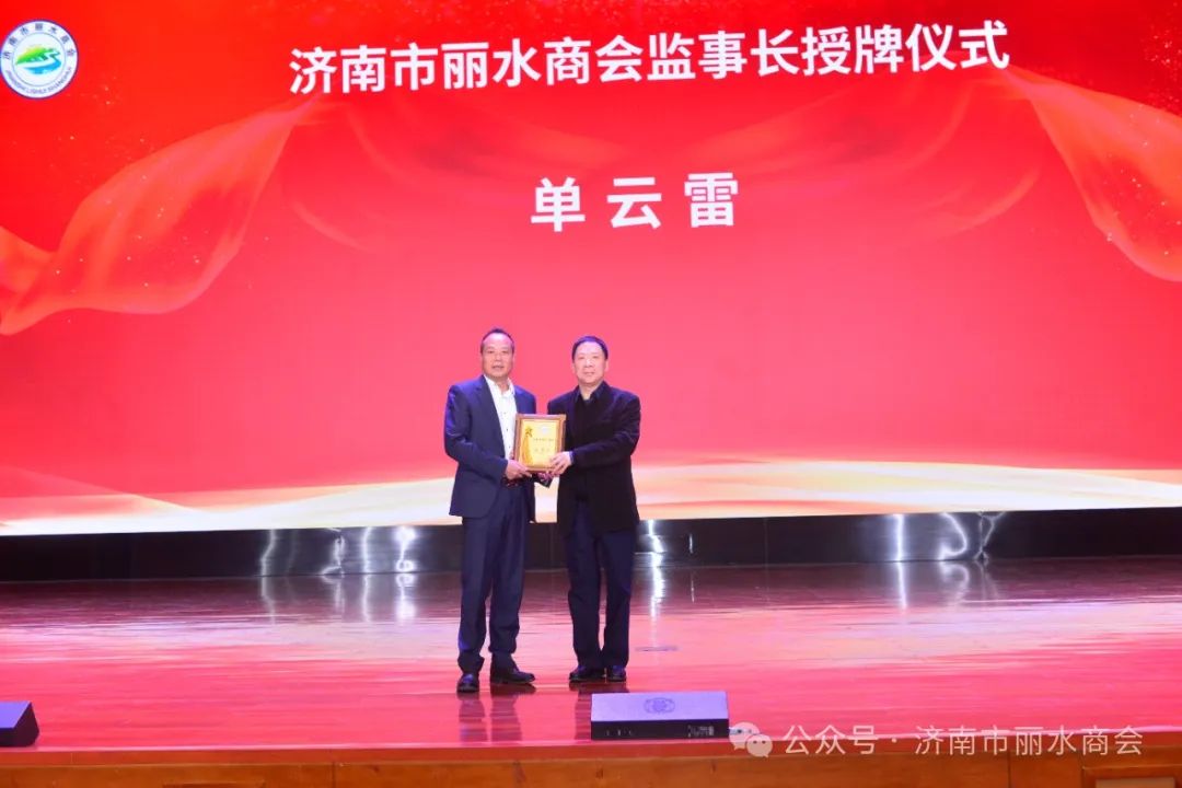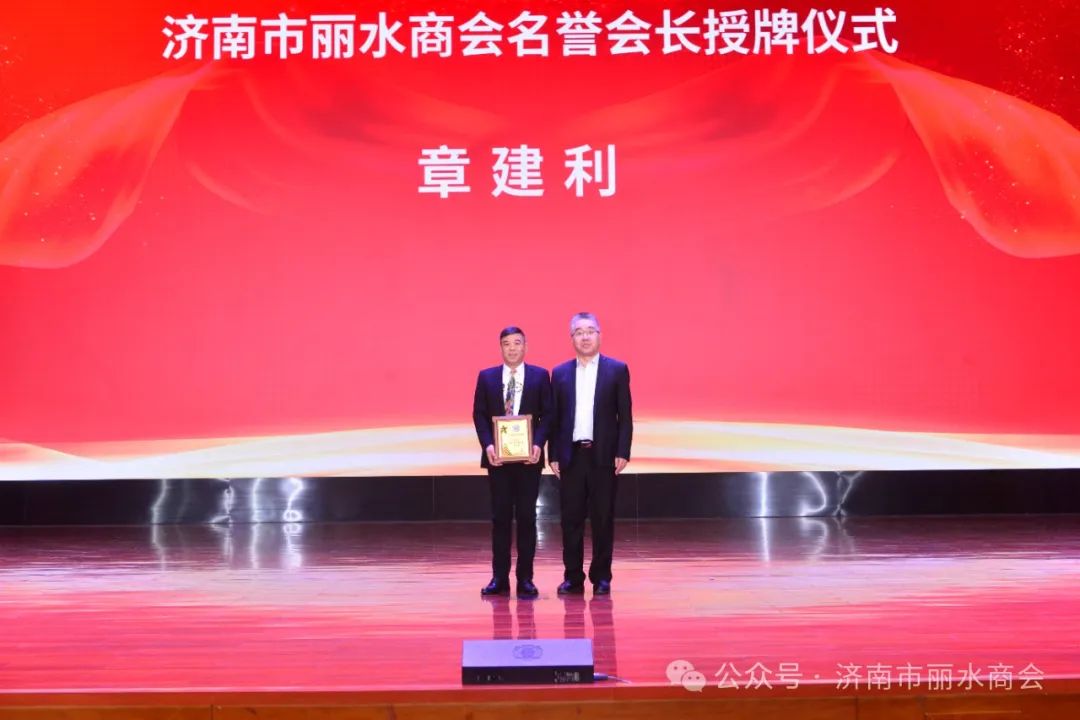 现场还举行了隆重的揭牌授牌仪式。其中,我会常务副会长章建利现场被颁授济南市丽水商会名誉会长,副会长单云雷被颁授丽水商会监事长。