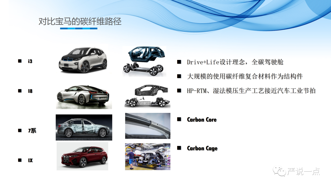 而从全球来看,宝马汽车在碳纤维材料的关注很早(宝马汽车专家解读车用碳纤维技术),到目前的宝马IX的Carbon Cage,碳纤维由可见到不可见,由大幅度应用到关键部位应用,正是体现了碳纤维的关键性能。