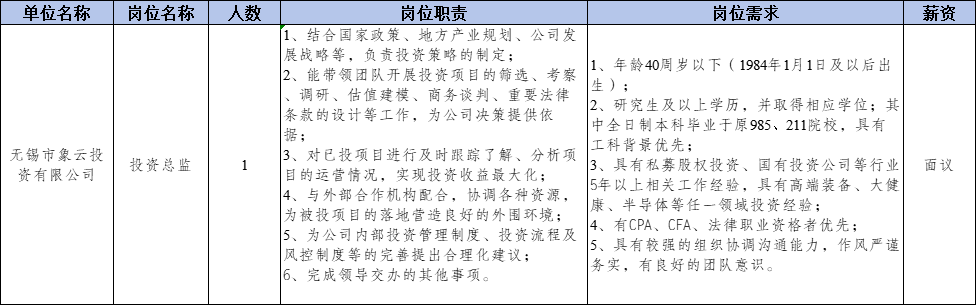 无锡市象云投资有限公司为无锡市梁溪产业发展集团有限公司下属全资子公司,现因公司业务发展需要,委托第三方机构面向社会公开招聘投资总监1名,具体公告如下: