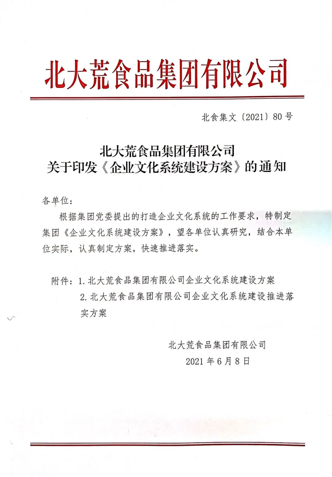 为了更好地推进方案执行,北大荒食品集团印发《企业文化系统建设推进落实方案》,对企业文化建设推进的方法步骤、具体目标、重点项目、实施方案进行全面布置。