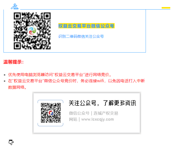 可在权益云交易平台搜索查看标的信息,报名及竞价请微信关注公众号“权益云交易平台”或电脑访问权益云交易平台。